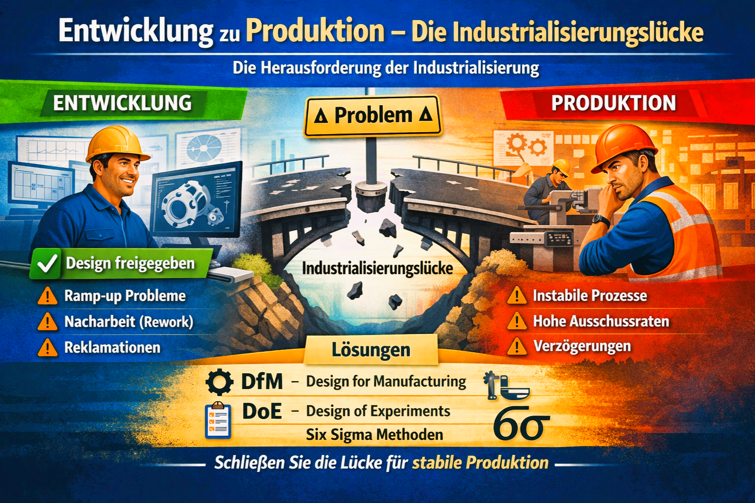Der Übergang von Entwicklung zu Serienfertigung wird häufig unterschätzt. Genau hier entsteht die sogenannte Industrialisierungslücke, die in vielen Unternehmen zu erheblichen Herausforderungen führt.